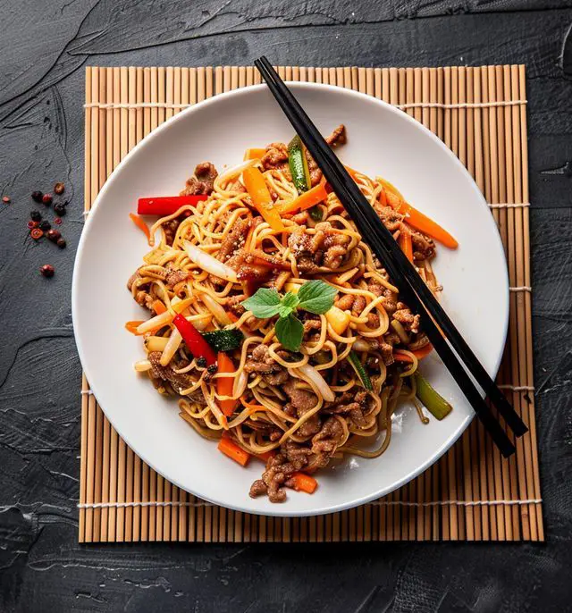 A delicious mix of crispy vegetables and tender noodles, all coated in a zesty, flavorful sauce - the perfect dish to make you feel good inside.