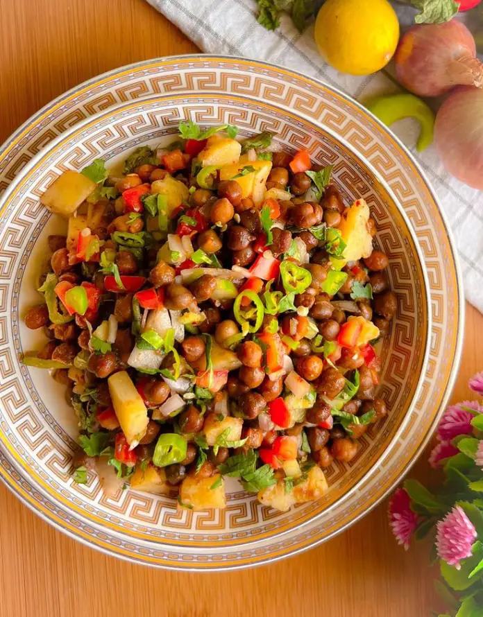 A refreshing mix of tangy, spiced chickpeas topped with fresh vegetables and zesty chutneys.