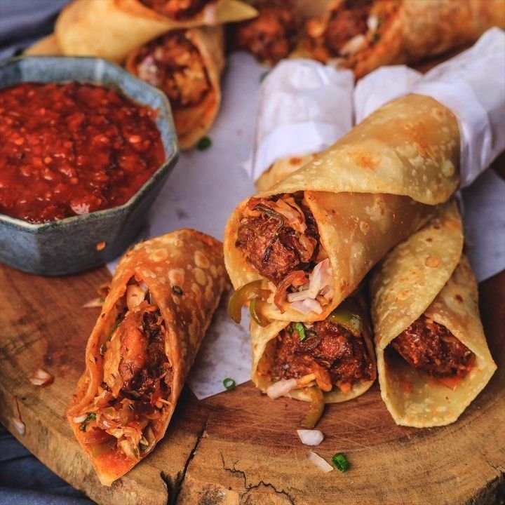 Try our Manchurian Rolls – a fusion of crispy rolls filled with tangy, spicy Manchurian veggies.